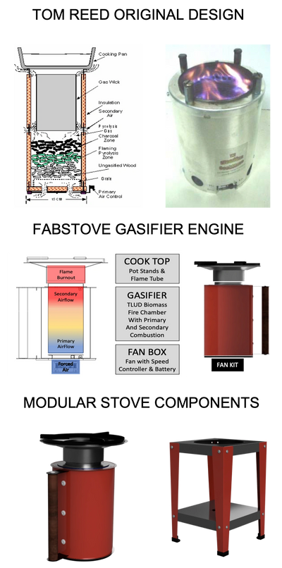 The downside of most TLUD stoves has been their cost relative to other simple stove designs and the ability for local manufacturing of the stoves. Since 2015 Ekasi Energy has worked modularising the TLUD design and making it suitable for mass production based on using steel sheeting and advanced fabrication tools for parts manufacture. the design was dubbed the "FabStove" (Forced Air Biomass Stove).